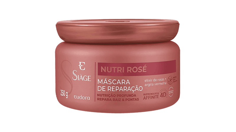 A linha Siàge Nutri Rosé é enriquecida com um poderoso Elixir de Rosas, rico em vitaminas e antioxidantes que nutrem os fios e tem alto poder de reparação, combinado a natural Argila Vermelha que nutre os fios, promovendo equilíbrio ao couro cabeludo e reparação profunda da raíz às pontas.